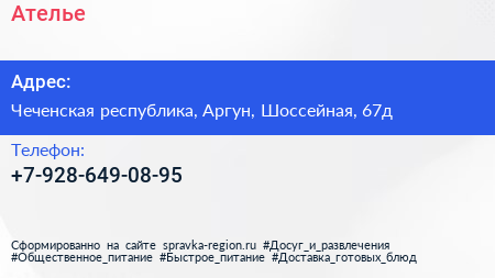 Ателье по адресу Чеченская республика, Аргун, Шоссейная, 67д в дальнейшем Организация, размещена в следующих категориях: