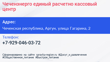 Чеченэнерго, единый расчетно-кассовый центр по адресу Чеченская республика, Аргун, улица Гагарина, 2 в дальнейшем Организация, размещена в следующих категориях: