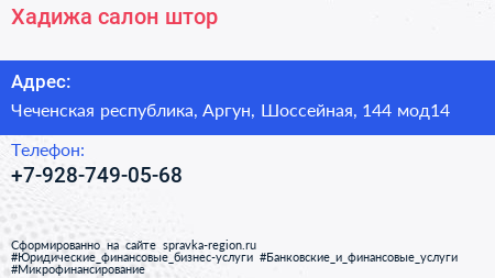 Хадижа, салон штор по адресу Чеченская республика, Аргун, Шоссейная, 144 мод14 в дальнейшем Организация, размещена в следующих категориях: