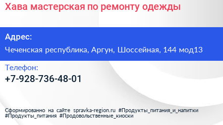 Хава, мастерская по ремонту одежды по адресу Чеченская республика, Аргун, Шоссейная, 144 мод13 в дальнейшем Организация, размещена в следующих категориях: