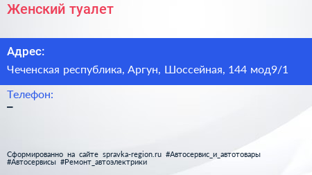 Женский туалет по адресу Чеченская республика, Аргун, Шоссейная, 144 мод9/1 в дальнейшем Организация, размещена в следующих категориях:
