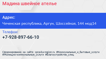 Мадина, швейное ателье по адресу Чеченская республика, Аргун, Шоссейная, 144 мод14 в дальнейшем Организация, размещена в следующих категориях: