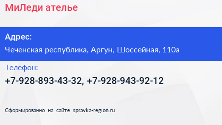 МиЛеди, ателье по адресу Чеченская республика, Аргун, Шоссейная, 110а в дальнейшем Организация, размещена в следующих категориях: