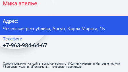 Мика, ателье по адресу Чеченская республика, Аргун, Карла Маркса, 1Б в дальнейшем Организация, размещена в следующих категориях: