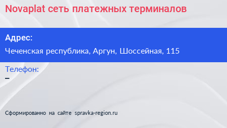 Novaplat, сеть платежных терминалов по адресу Чеченская республика, Аргун, Шоссейная, 115 в дальнейшем Организация, размещена в следующих категориях: