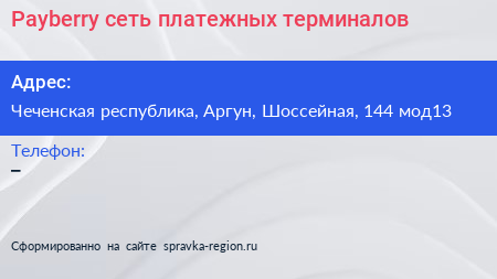 Payberry, сеть платежных терминалов по адресу Чеченская республика, Аргун, Шоссейная, 144 мод13 в дальнейшем Организация, размещена в следующих категориях: