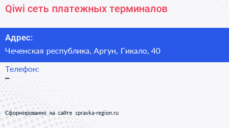 Qiwi, сеть платежных терминалов по адресу Чеченская республика, Аргун, Гикало, 40 в дальнейшем Организация, размещена в следующих категориях: