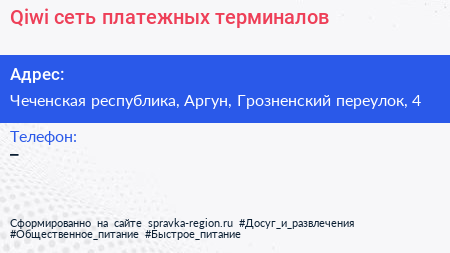 Qiwi, сеть платежных терминалов по адресу Чеченская республика, Аргун, Грозненский переулок, 4 в дальнейшем Организация, размещена в следующих категориях: