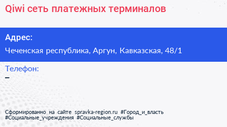 Qiwi, сеть платежных терминалов по адресу Чеченская республика, Аргун, Кавказская, 48/1 в дальнейшем Организация, размещена в следующих категориях: