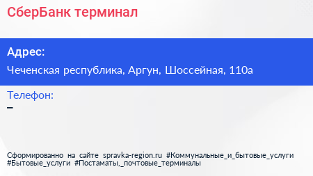 СберБанк, терминал по адресу Чеченская республика, Аргун, Шоссейная, 110а в дальнейшем Организация, размещена в следующих категориях: