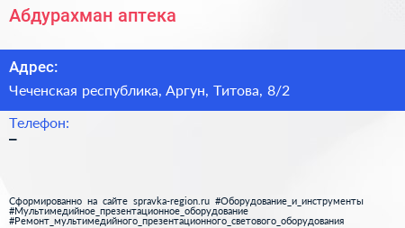 Абдурахман, аптека по адресу Чеченская республика, Аргун, Титова, 8/2 в дальнейшем Организация, размещена в следующих категориях: