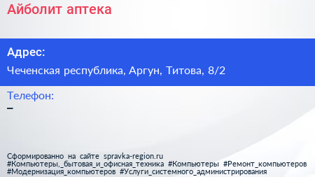 Айболит, аптека по адресу Чеченская республика, Аргун, Титова, 8/2 в дальнейшем Организация, размещена в следующих категориях: