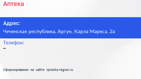 Аптека по адресу Чеченская республика, Аргун, Карла Маркса, 2а в дальнейшем Организация, размещена в следующих категориях: