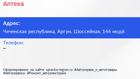 Аптека по адресу Чеченская республика, Аргун, Шоссейная, 144 мод6 в дальнейшем Организация, размещена в следующих категориях: