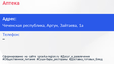 Аптека по адресу Чеченская республика, Аргун, Зайтаева, 1а в дальнейшем Организация, размещена в следующих категориях: