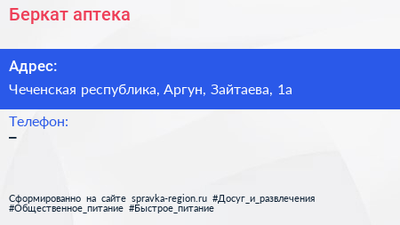 Беркат, аптека по адресу Чеченская республика, Аргун, Зайтаева, 1а в дальнейшем Организация, размещена в следующих категориях: