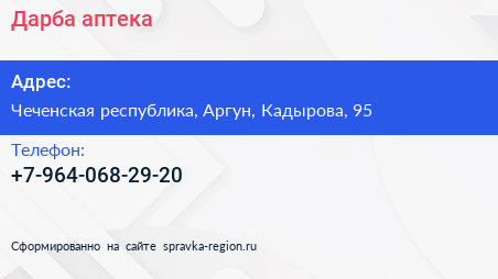 Дарба, аптека по адресу Чеченская республика, Аргун, Кадырова, 95 в дальнейшем Организация, размещена в следующих категориях: