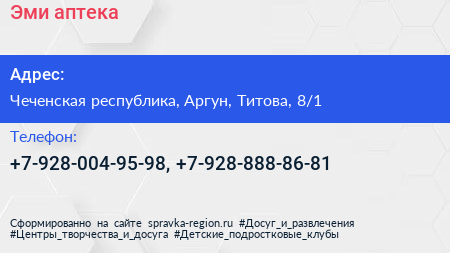 Эми, аптека по адресу Чеченская республика, Аргун, Титова, 8/1 в дальнейшем Организация, размещена в следующих категориях: