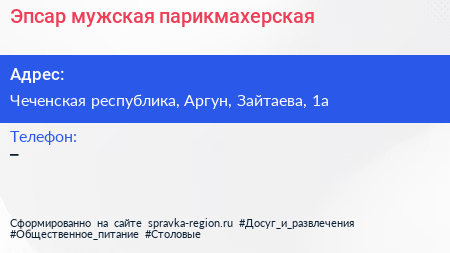 Эпсар, мужская парикмахерская по адресу Чеченская республика, Аргун, Зайтаева, 1а в дальнейшем Организация, размещена в следующих категориях: