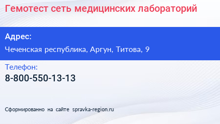 Гемотест, сеть медицинских лабораторий по адресу Чеченская республика, Аргун, Титова, 9 в дальнейшем Организация, размещена в следующих категориях: