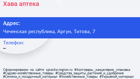Хава, аптека по адресу Чеченская республика, Аргун, Титова, 7 в дальнейшем Организация, размещена в следующих категориях: