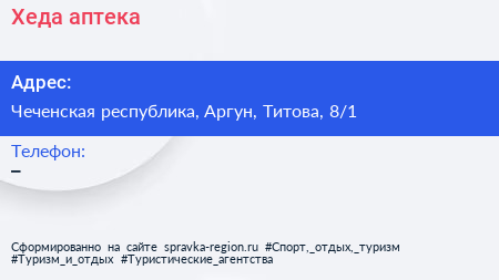 Хеда, аптека по адресу Чеченская республика, Аргун, Титова, 8/1 в дальнейшем Организация, размещена в следующих категориях: