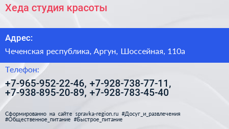 Хеда, студия красоты по адресу Чеченская республика, Аргун, Шоссейная, 110а в дальнейшем Организация, размещена в следующих категориях: