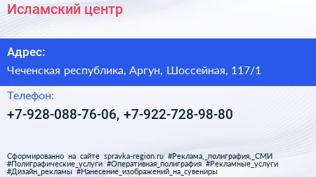 Исламский центр по адресу Чеченская республика, Аргун, Шоссейная, 117/1 в дальнейшем Организация, размещена в следующих категориях: