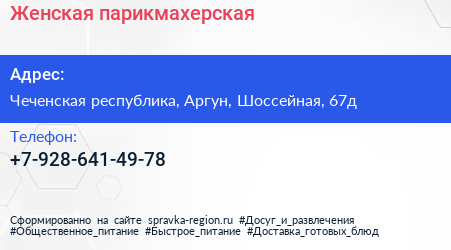 Женская парикмахерская по адресу Чеченская республика, Аргун, Шоссейная, 67д в дальнейшем Организация, размещена в следующих категориях: