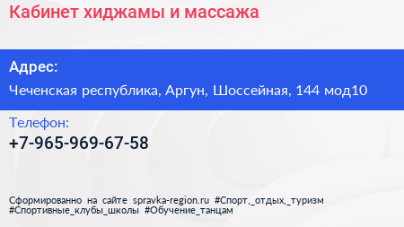 Кабинет хиджамы и массажа по адресу Чеченская республика, Аргун, Шоссейная, 144 мод10 в дальнейшем Организация, размещена в следующих категориях: