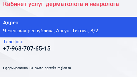 Кабинет услуг дерматолога и невролога по адресу Чеченская республика, Аргун, Титова, 8/2 в дальнейшем Организация, размещена в следующих категориях: