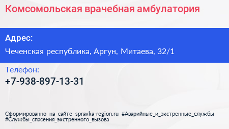Комсомольская врачебная амбулатория по адресу Чеченская республика, Аргун, Митаева, 32/1 в дальнейшем Организация, размещена в следующих категориях: