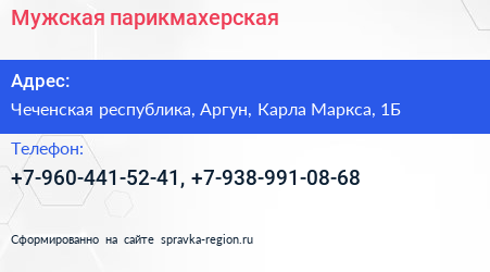 Мужская парикмахерская по адресу Чеченская республика, Аргун, Карла Маркса, 1Б в дальнейшем Организация, размещена в следующих категориях: