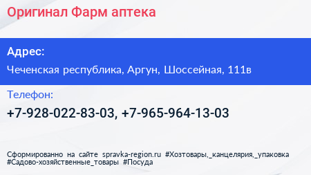 Оригинал Фарм, аптека по адресу Чеченская республика, Аргун, Шоссейная, 111в в дальнейшем Организация, размещена в следующих категориях: