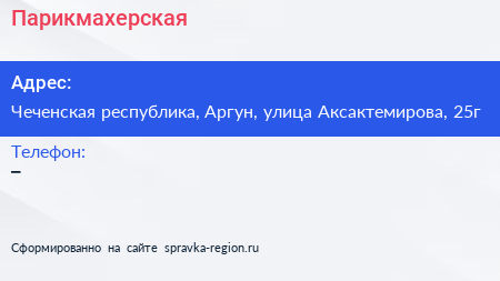 Парикмахерская по адресу Чеченская республика, Аргун, улица Аксактемирова, 25г в дальнейшем Организация, размещена в следующих категориях: