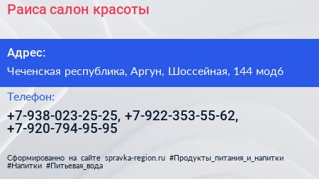 Раиса, салон красоты по адресу Чеченская республика, Аргун, Шоссейная, 144 мод6 в дальнейшем Организация, размещена в следующих категориях: