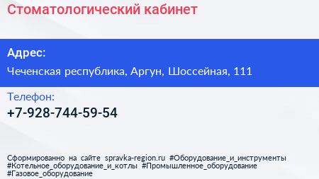 Стоматологический кабинет по адресу Чеченская республика, Аргун, Шоссейная, 111 в дальнейшем Организация, размещена в следующих категориях: