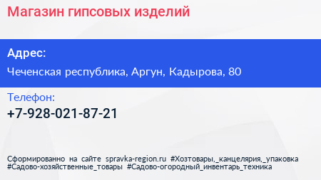 Магазин гипсовых изделий по адресу Чеченская республика, Аргун, Кадырова, 80 в дальнейшем Организация, размещена в следующих категориях: