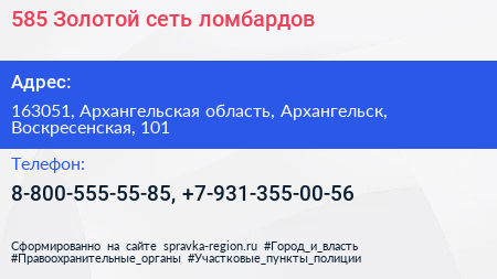 585*Золотой, сеть ломбардов по адресу 163051, Архангельская область, Архангельск, Воскресенская, 101 в дальнейшем Организация, размещена в следующих категориях: