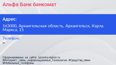 Альфа-Банк, банкомат по адресу 163000, Архангельская область, Архангельск, Карла Маркса, 15 в дальнейшем Организация, размещена в следующих категориях:
