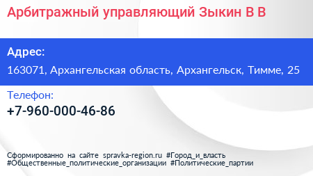Арбитражный управляющий Зыкин В.В. по адресу 163071, Архангельская область, Архангельск, Тимме, 25 в дальнейшем Организация, размещена в следующих категориях: