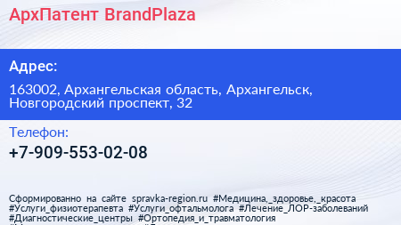 АрхПатент & BrandPlaza по адресу 163002, Архангельская область, Архангельск, Новгородский проспект, 32 в дальнейшем Организация, размещена в следующих категориях: