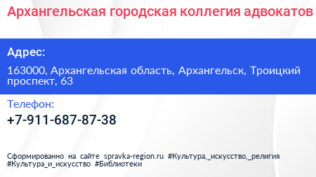 Архангельская городская коллегия адвокатов по адресу 163000, Архангельская область, Архангельск, Троицкий проспект, 63 в дальнейшем Организация, размещена в следующих категориях: