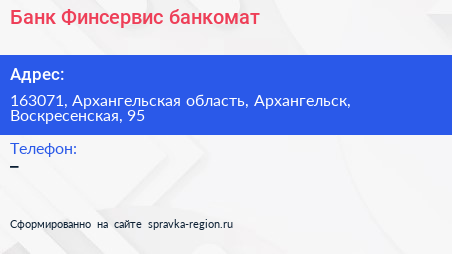 Банк Финсервис, банкомат по адресу 163071, Архангельская область, Архангельск, Воскресенская, 95 в дальнейшем Организация, размещена в следующих категориях: