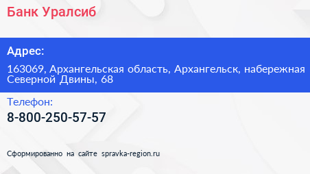 Банк Уралсиб по адресу 163069, Архангельская область, Архангельск, набережная Северной Двины, 68 в дальнейшем Организация, размещена в следующих категориях: