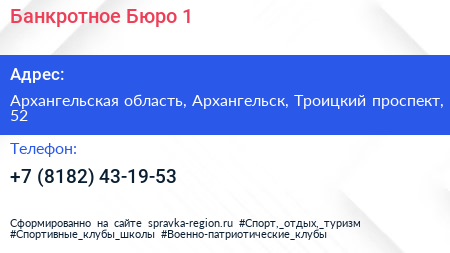 Банкротное Бюро №1 по адресу Архангельская область, Архангельск, Троицкий проспект, 52 в дальнейшем Организация, размещена в следующих категориях: