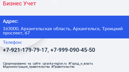 Бизнес Учет по адресу 163000, Архангельская область, Архангельск, Троицкий проспект, 67 в дальнейшем Организация, размещена в следующих категориях: