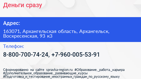 Деньги сразу по адресу 163071, Архангельская область, Архангельск, Воскресенская, 93 к3 в дальнейшем Организация, размещена в следующих категориях: