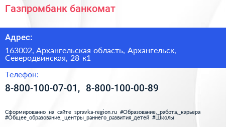 Газпромбанк, банкомат по адресу 163002, Архангельская область, Архангельск, Северодвинская, 28 к1 в дальнейшем Организация, размещена в следующих категориях: