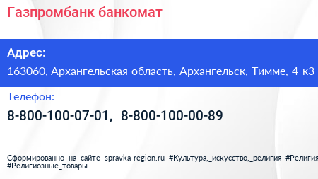 Газпромбанк, банкомат по адресу 163060, Архангельская область, Архангельск, Тимме, 4 к3 в дальнейшем Организация, размещена в следующих категориях: